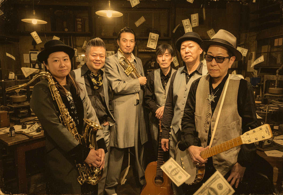 左から、DEVIL(Tenor Sax, Cho)/ H.SATO(Drums, Cho)/ YU-JIN(Trumpet, Cho) YUJI TAKIZAWA(Guitar, Cho)/ SHIN MURAYAMA(W.BASS, Cho)/ AKIRA "BO$$" KITSUNO(Box, Banjo.G)